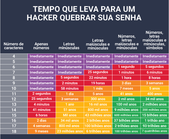 Veja abaixo quanto tempo leva para quebrar uma senha de acordo com a quantidade total e tipos de caracteres que a formam: